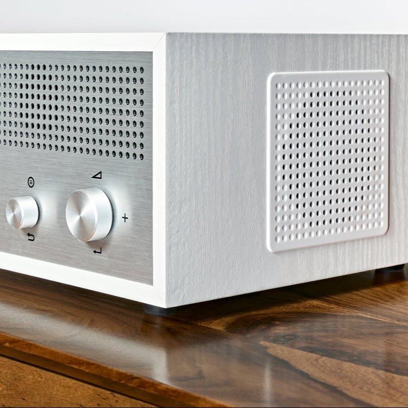 Der hochwertige weiße Holzkorpus des Internetradios Verona ist ein optischer Blickfang und sorgt mit seinem schlichten, rechteckigen Design für Vintage-Flair in jedem Interieur.